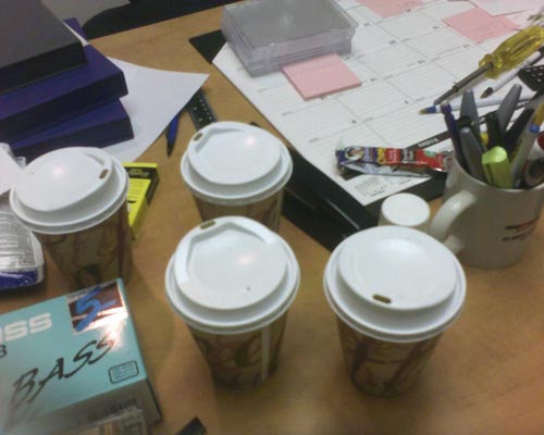 This is the office of AJ, our head video editor. It's my understanding that those cups contain tea, not coffee. Crazy.